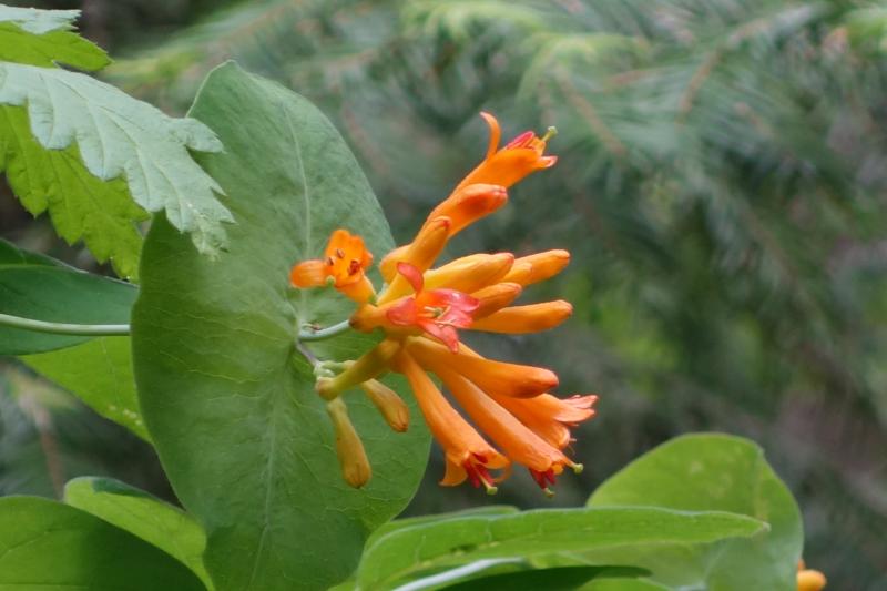 Characteristics: This honeysuckle runs freely on the ground or will climb up trees with stems sometimes reaching a length of 18 ft. The large, orange, trumpet-shaped flowers occur in dense clusters. Fruits are red. Leaves are deciduous. Blooms attract hummingbirds
